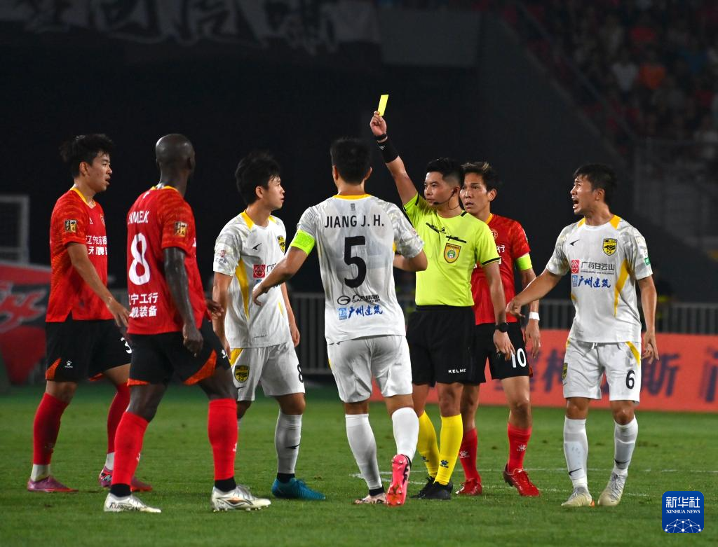 8月2日,主裁判崔跃强向广东广州豹队球员蔡浩畅(左三)出示黄牌。