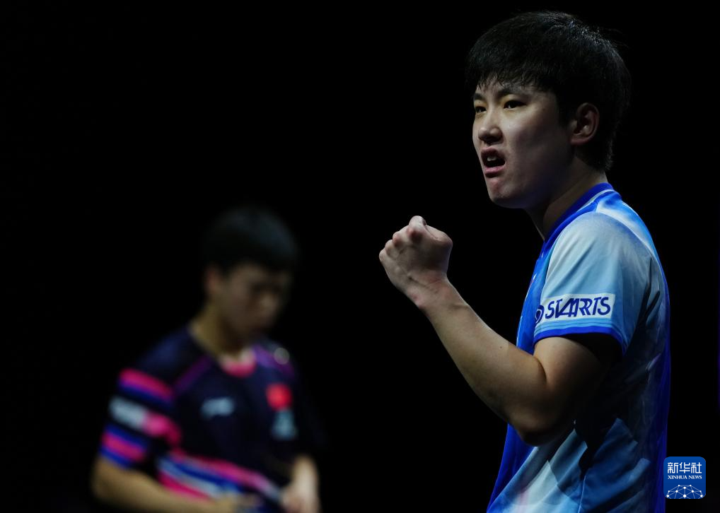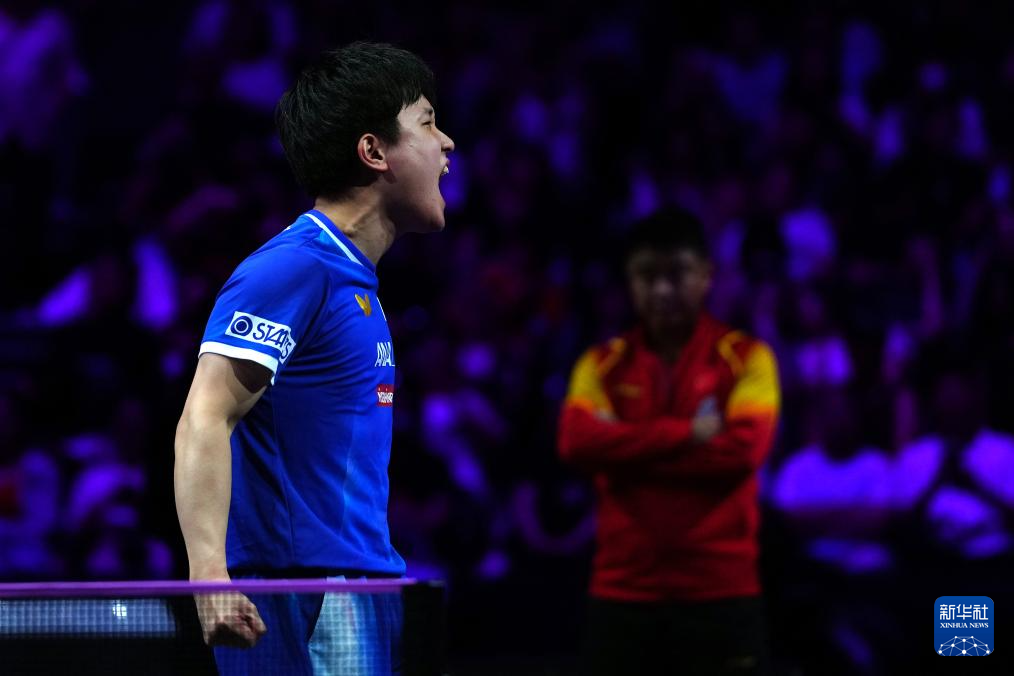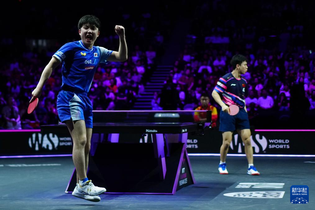 8月10日,张本智和(前)在比赛中庆祝得分。