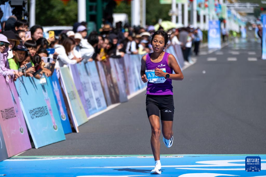 8月10日,中国选手通拉嘎在比赛中。她以2小时54分21秒的成绩获得女子全程马拉松季军。