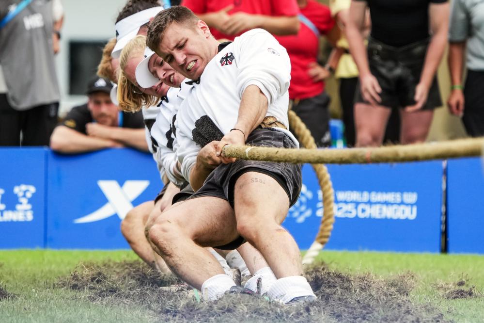 8月11日,德国队在成都世运会混合室外拔河580公斤级铜牌赛中3:0战胜意大利队。图为德国队在比赛中。新华社记者 李博 摄