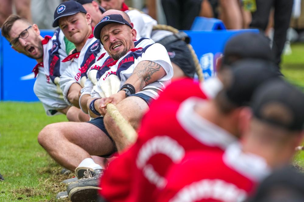 8月9日,英国队(后)在成都世运会男子室外拔河640公斤级金牌赛中。当日,英国队以3:0战胜瑞士队,获得冠军。新华社记者 李博 摄