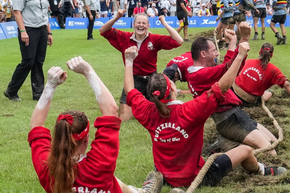 8月11日,成都世运会混合室外拔河580公斤级决赛中,瑞士队以3:0战胜比利时队,获得冠军。图为瑞士队队员在赛后庆祝。 新华社记者 李博 摄