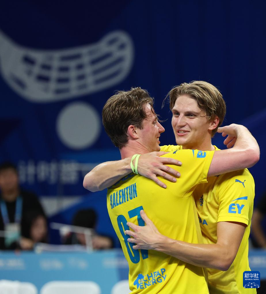 8月13日,瑞典队球员埃米尔(左)与队友庆祝夺冠。