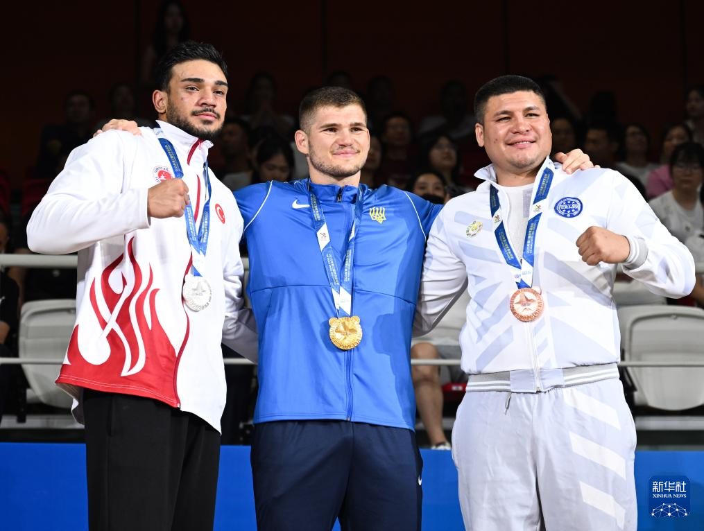 8月14日,冠军乌克兰选手罗曼(中)、亚军土耳其选手厄泽尔(左)与季军乌兹别克斯坦选手巴拉托夫在颁奖仪式上。