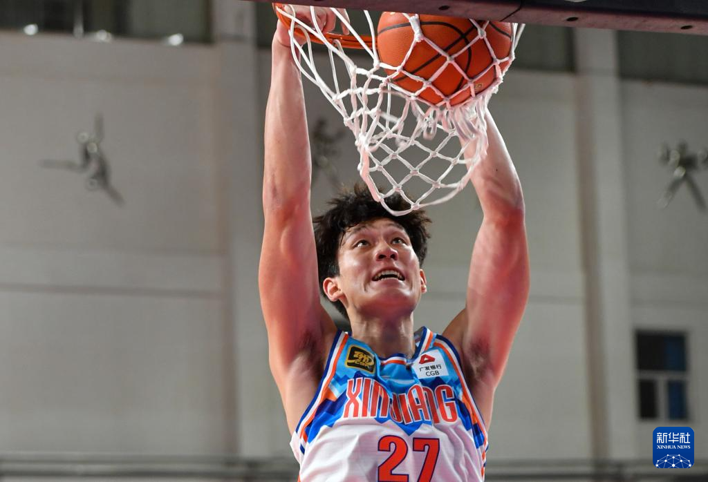 8月16日,新疆伊力特队球员曲笑宇在比赛中扣篮。