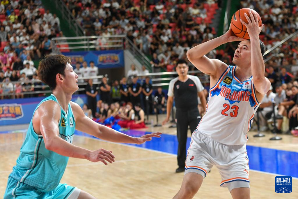 8月16日,新疆伊力特队球员阿不都沙拉木(右)在比赛中投篮。