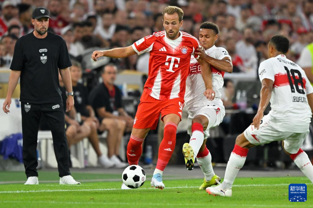 8月16日,拜仁慕尼黑队球员哈里·凯恩(左二)在比赛中护球。