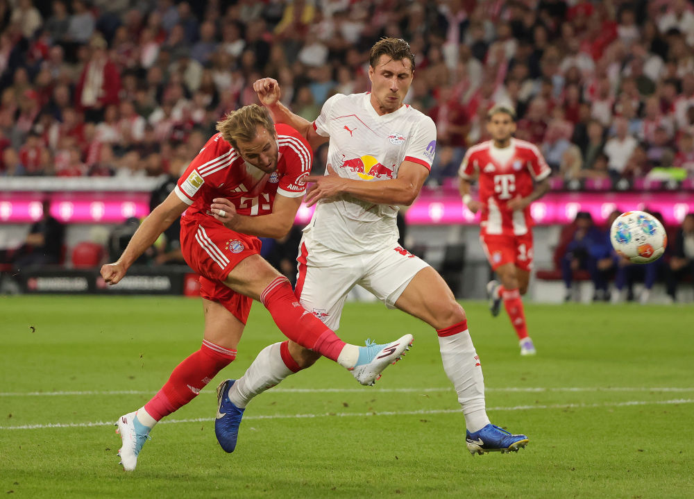 8月22日,拜仁慕尼黑队球员凯恩(左)与莱比锡队球员在比赛中拼抢。新华社发(菲利普·鲁伊兹摄)