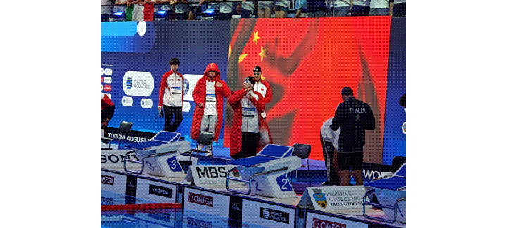 8月19日,女子4X200米自由泳接力,杨佩琪与严窕珊、龚真琦、罗名钰为中国队锁定金牌。世界泳联官网图片