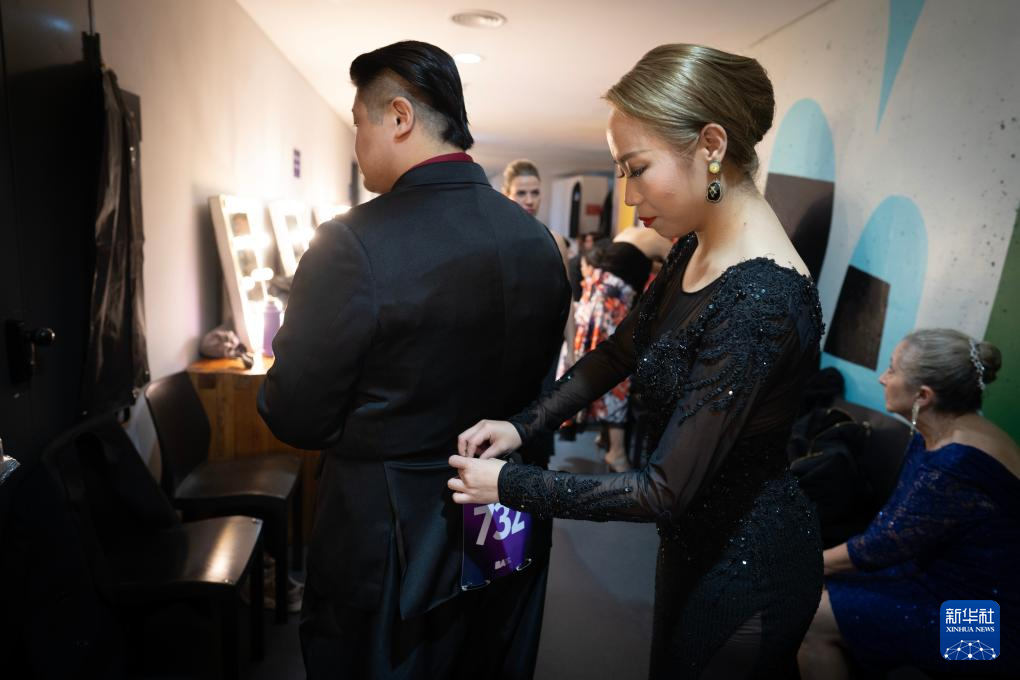 8月27日,苏君强(左)和郭星竹在探戈世界杯沙龙组四分之一决赛前准备。新华社发(马丁·萨巴拉摄)