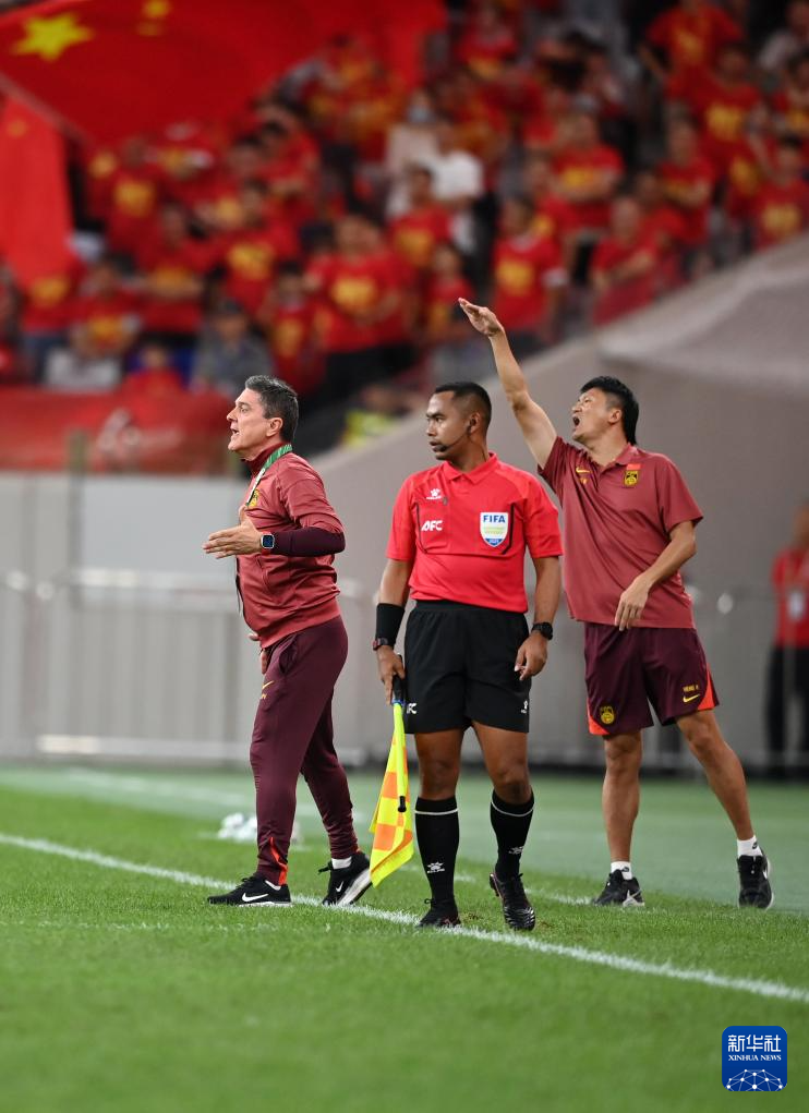 9月6日,中国队主教练安东尼奥·普切(左)在比赛中指挥。