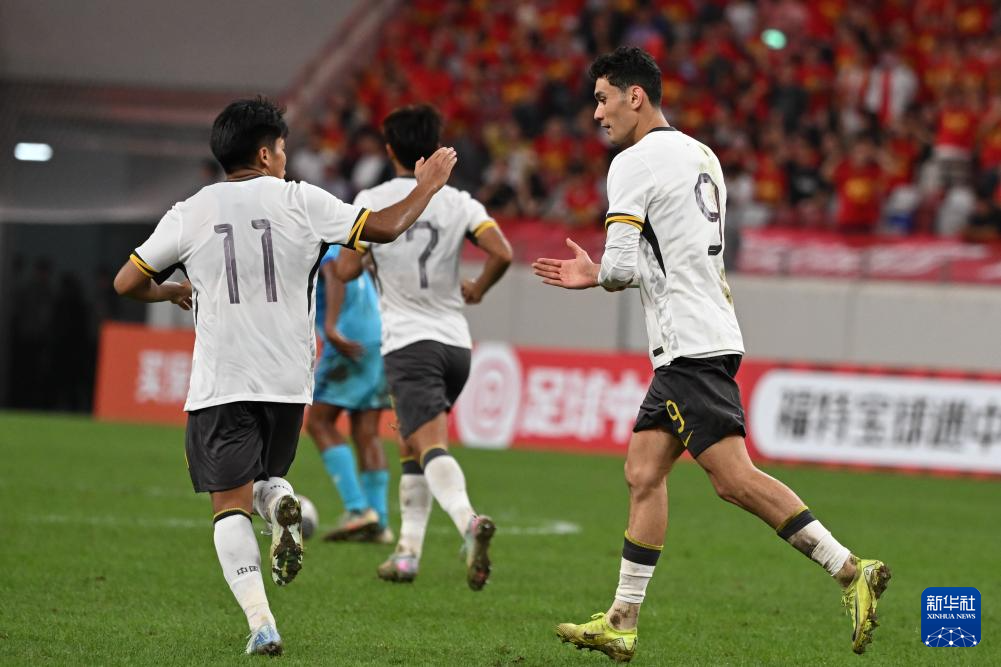 9月6日,中国队球员拜合拉木·阿卜杜外力(右)在进球后庆祝。