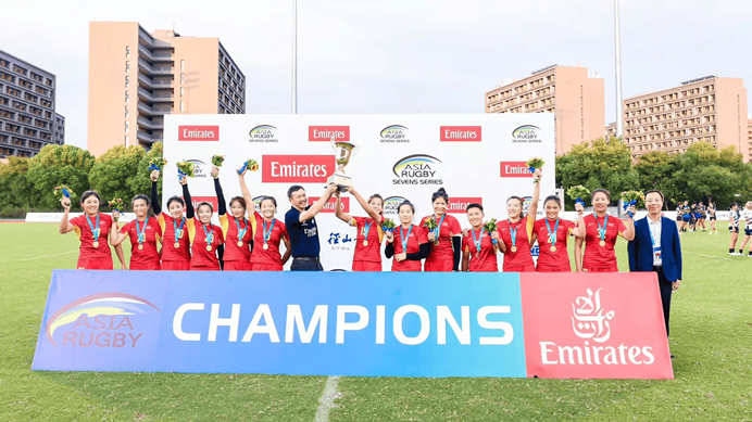 图为中国女子橄榄球队去年在赛事中捧杯。(主办方供图)