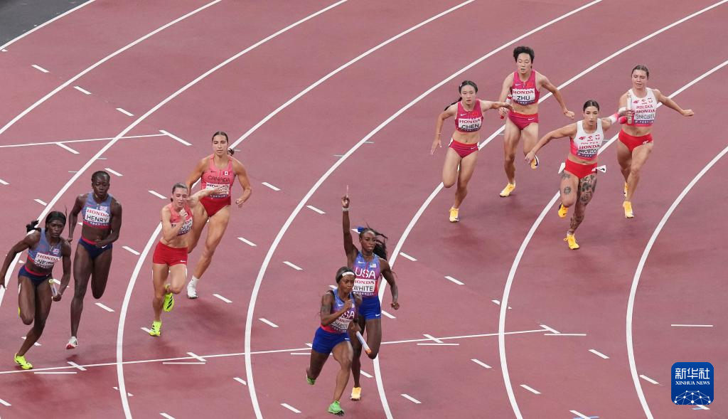 9月20日,中国队第三棒选手朱俊颖(右三)和第四棒选手陈妤颉(右四)在比赛中交接棒。