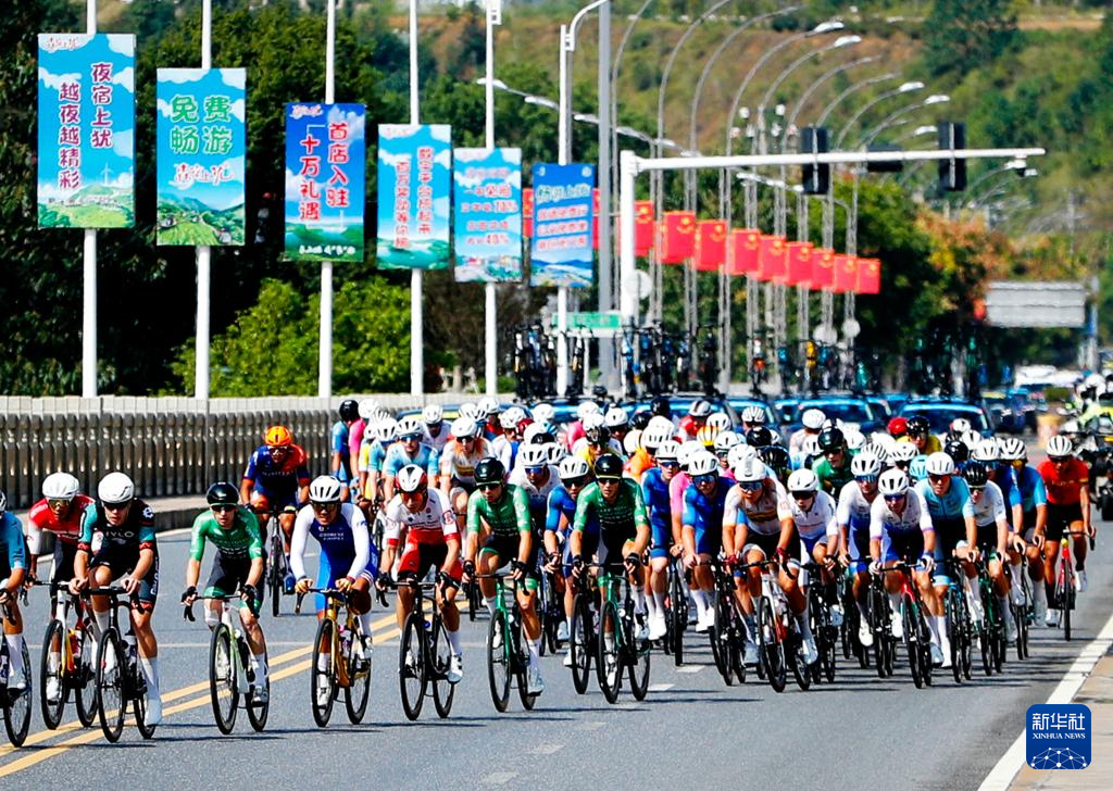 9月26日,参赛选手在比赛中骑行(无人机照片)。