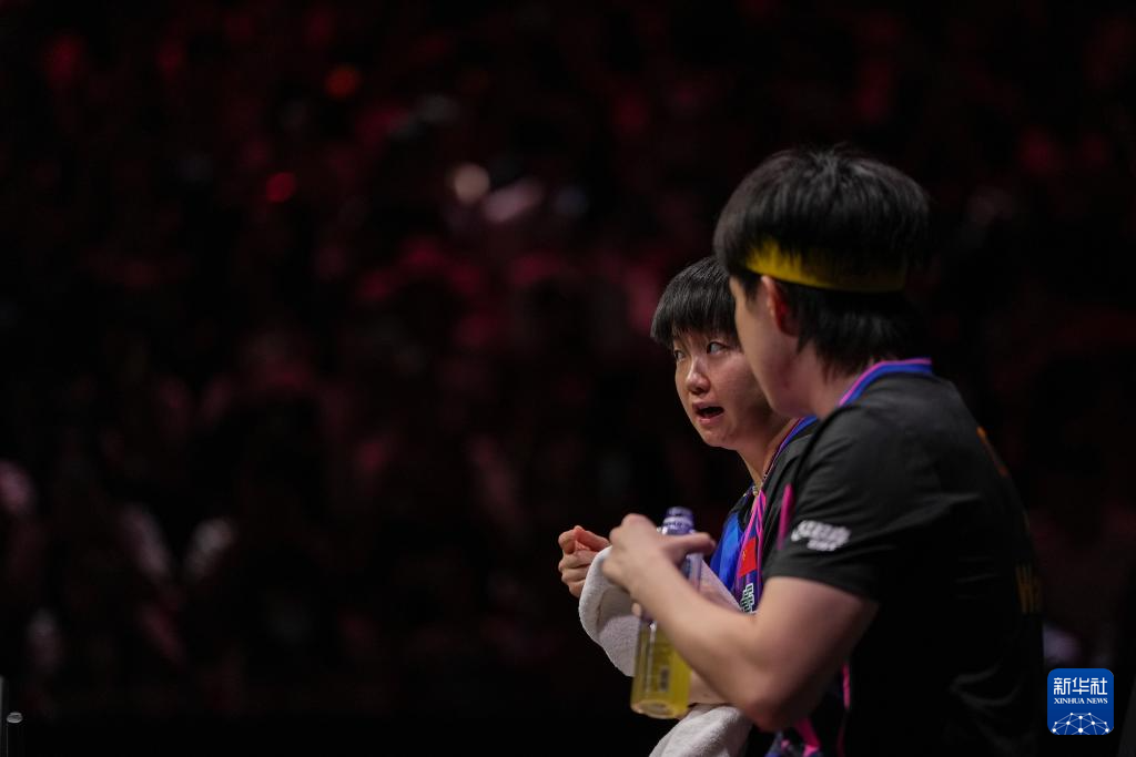10月1日,中国组合王楚钦/孙颖莎(左)在比赛间隙交流。