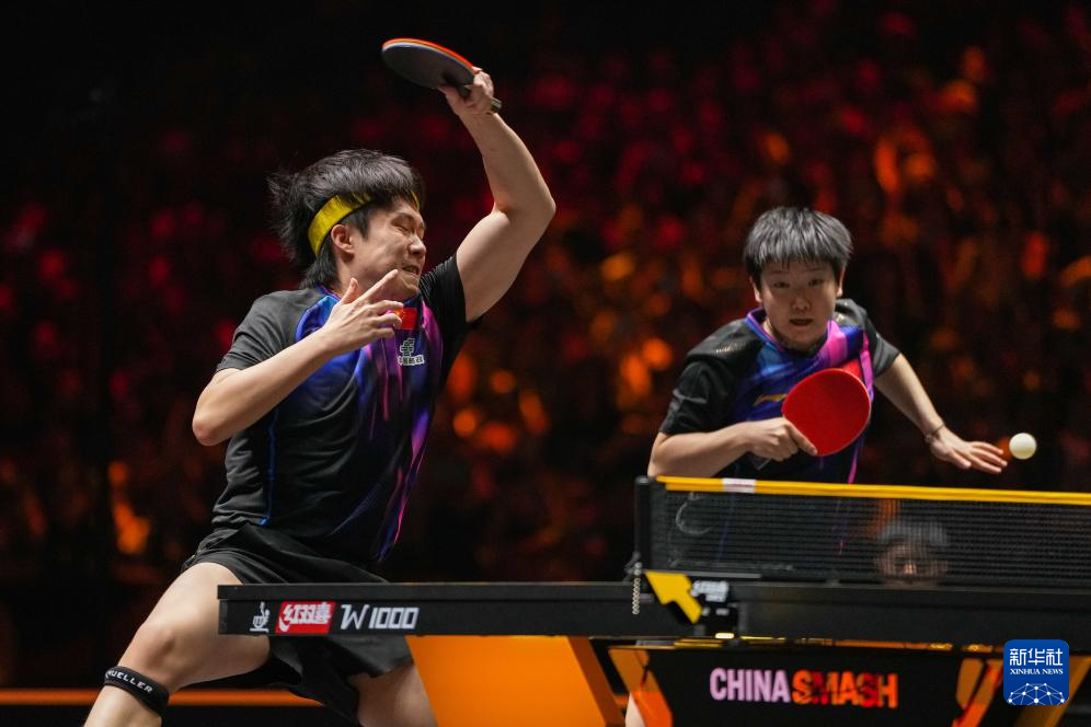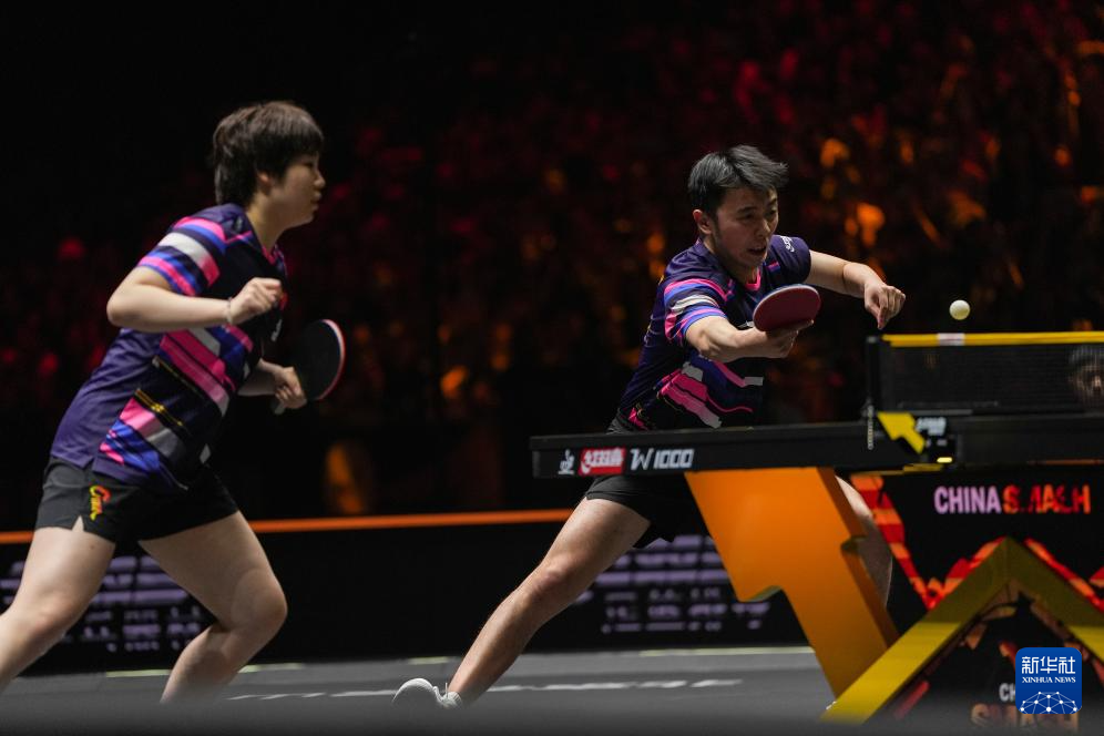 10月1日,中国组合王楚钦/孙颖莎(右)在比赛中。