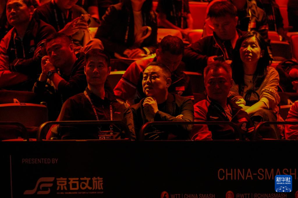 10月1日,王励勤(前左)、刘国梁(前中)和秦志戬(前右)在现场观看比赛。
