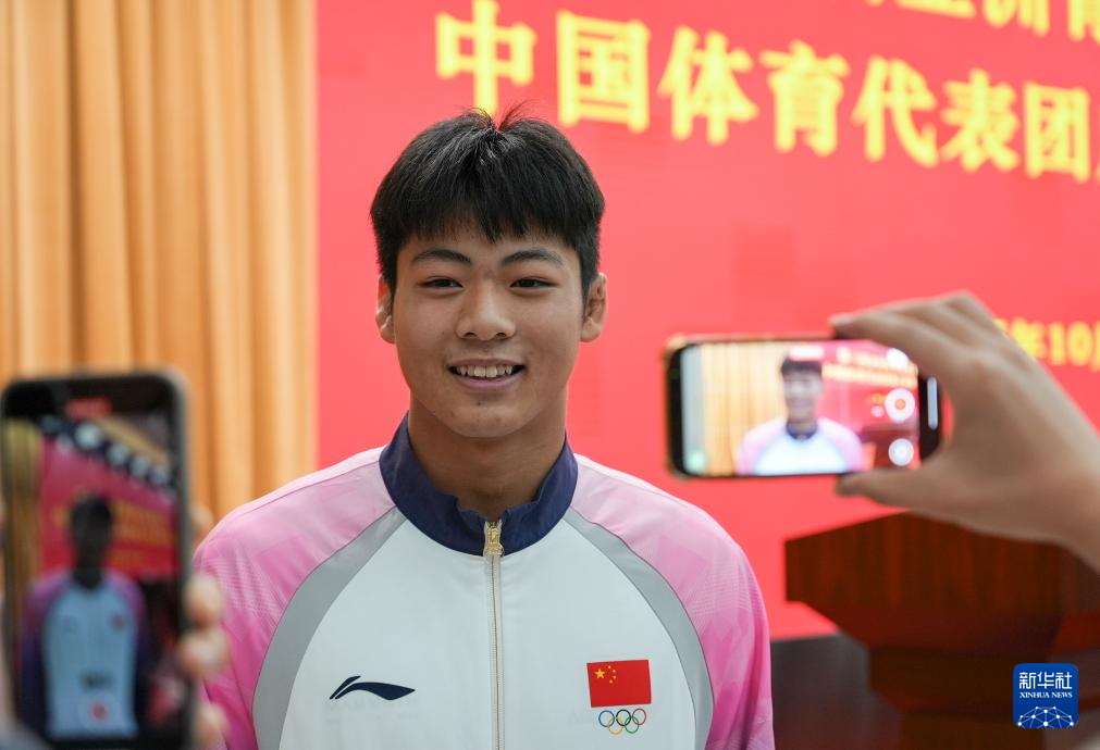 10月13日,柔道运动员吴沛聪在大会后接受采访。