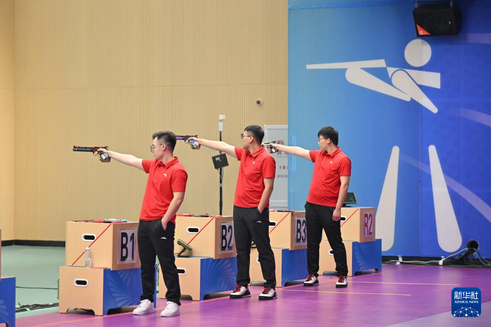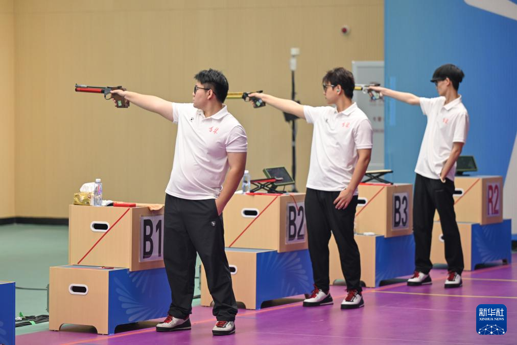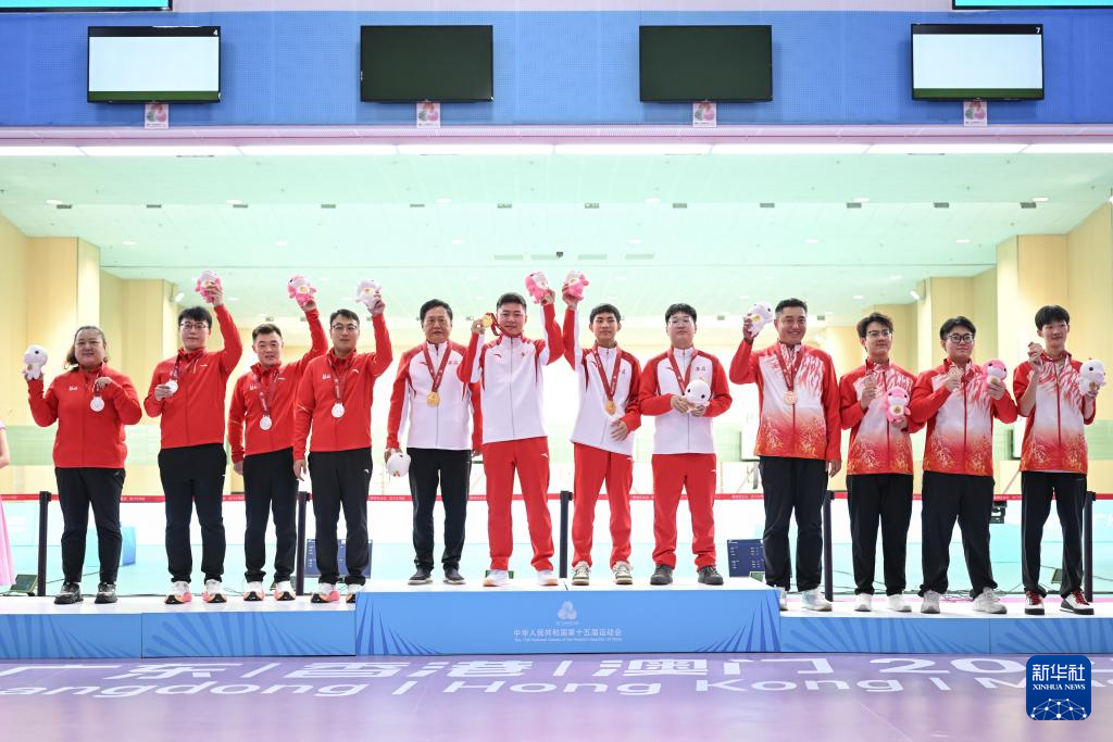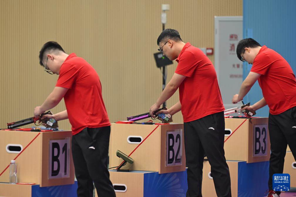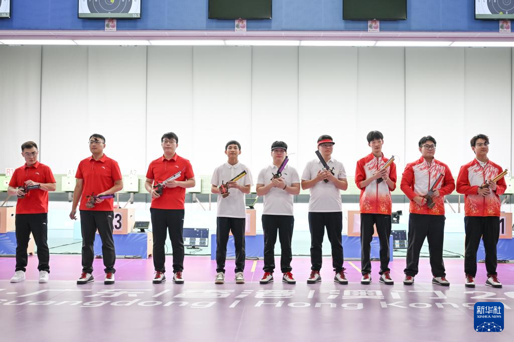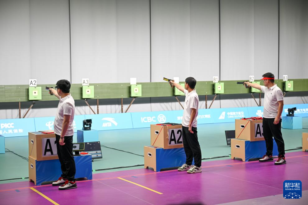 当日,第十五届全运会射击男子10米气手枪团体决赛在广州举行。