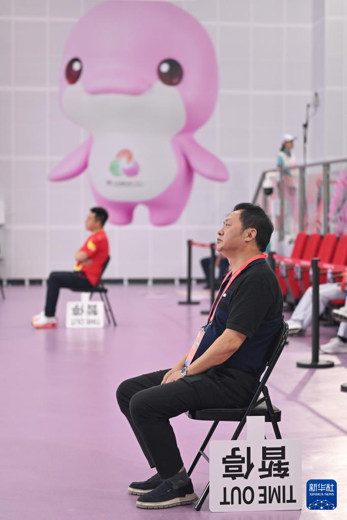 10月16日,在射击男子10米气手枪团体决赛金牌赛中,教练员在场边观赛。