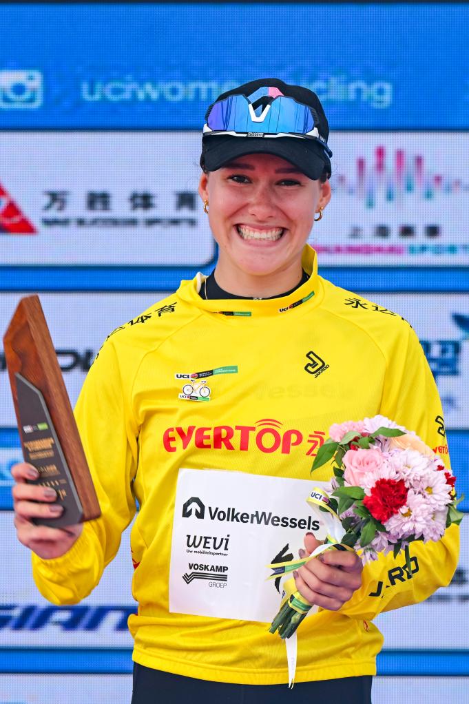 10月16日,瓦尔克韦塞尔斯车队的安妮·克妮珍宝身着代表总成绩第一名的黄衫在颁奖仪式上庆祝。新华社记者 陈浩明 摄