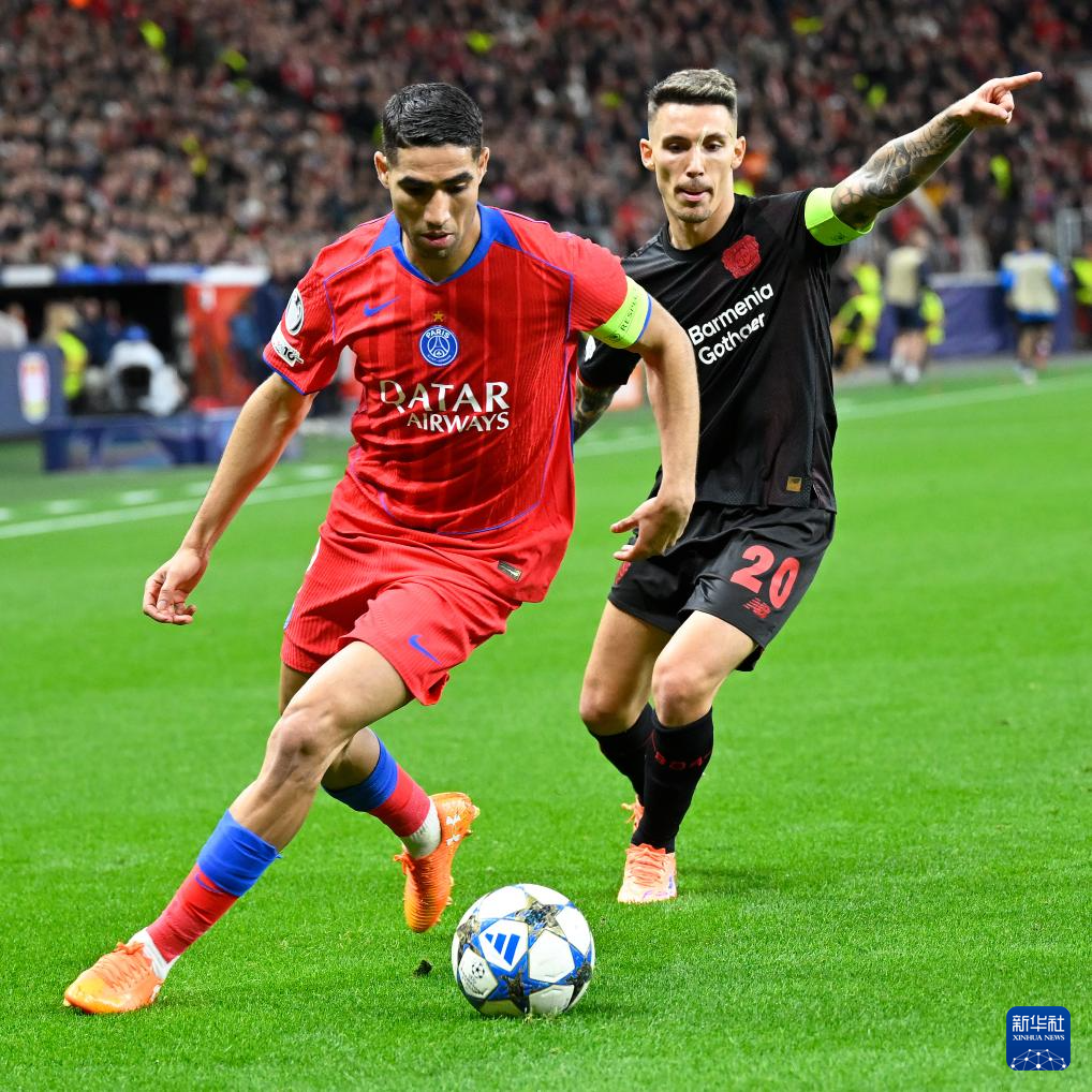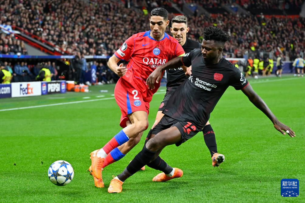 10月21日,勒沃库森队球员塔普索巴(右)和巴黎圣日耳曼队球员阿什拉夫(左)在比赛中拼抢。