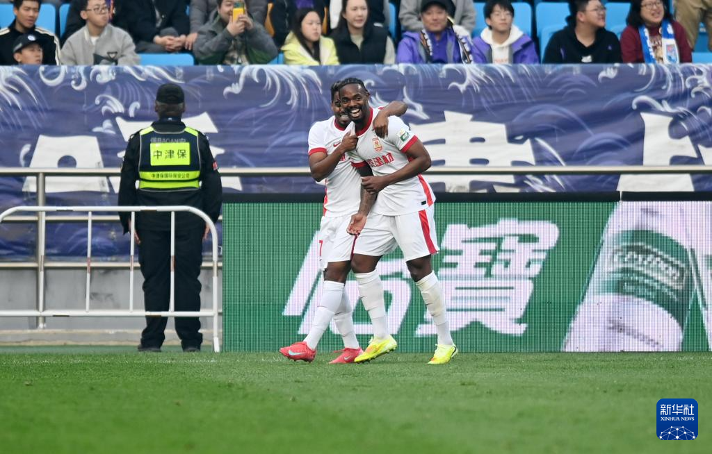 10月25日,长春亚泰队球员西普里安(右)在进球后和队友庆祝。