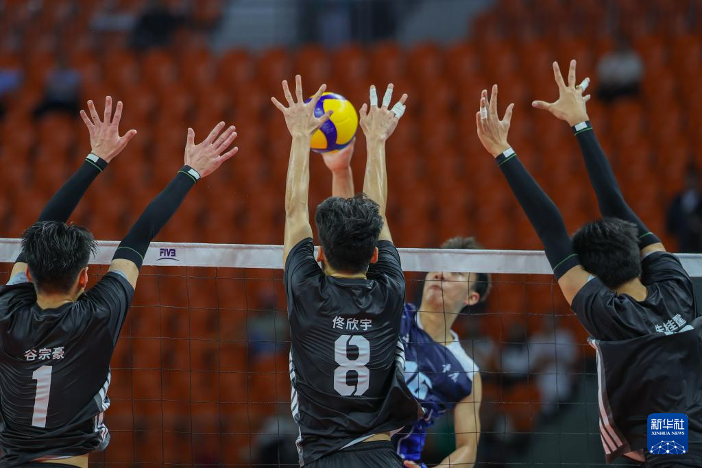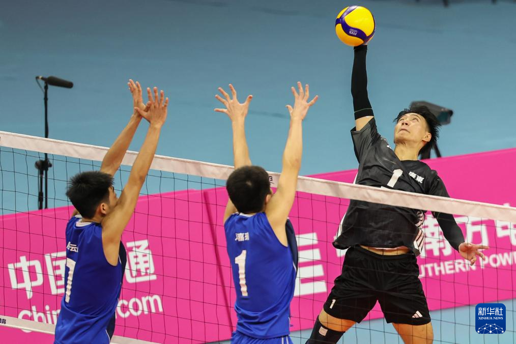 11月7日,广东队球员谷宗豪(左一)、佟欣宇(左二)、朱桂霆(右一)在比赛中拦网。