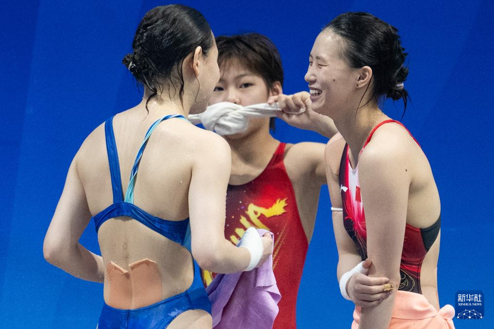 11月8日,上海队选手陈芋汐(右一)在比赛结束后。最终,她以423.7分的成绩晋级决赛。