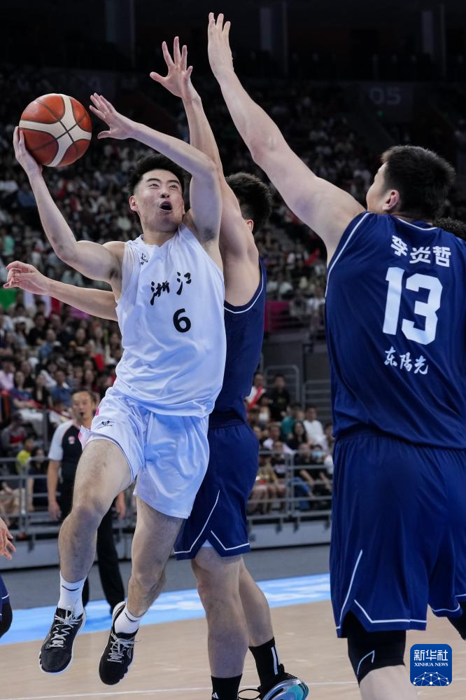 11月8日,浙江队球员余嘉豪(左)在比赛中上篮。