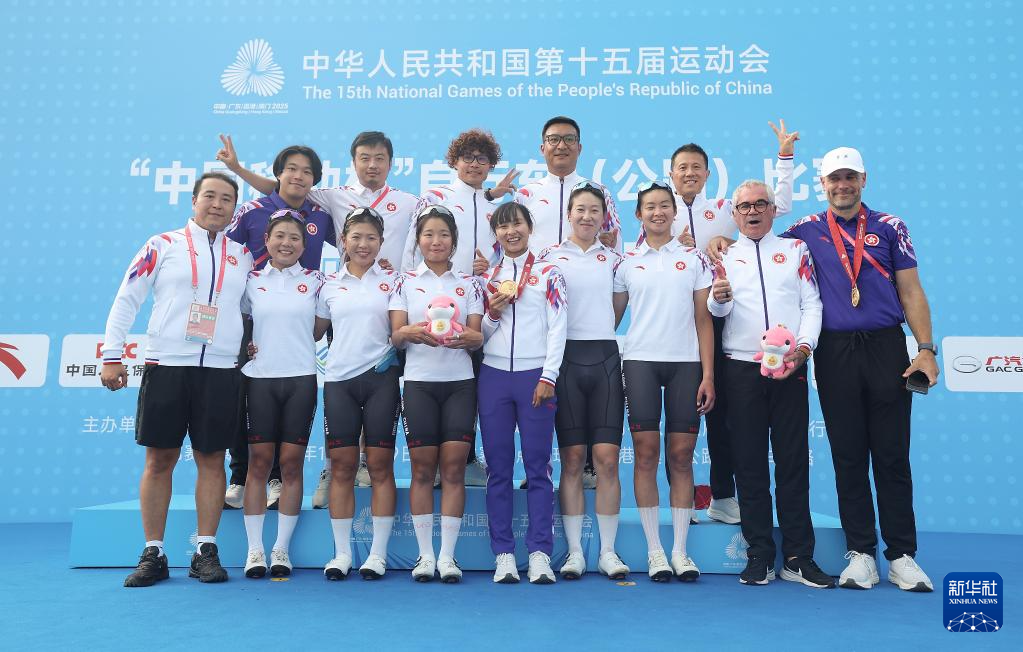11月9日,冠军香港队选手李思颖(前中)在颁奖仪式上与队友、教练合影庆祝。