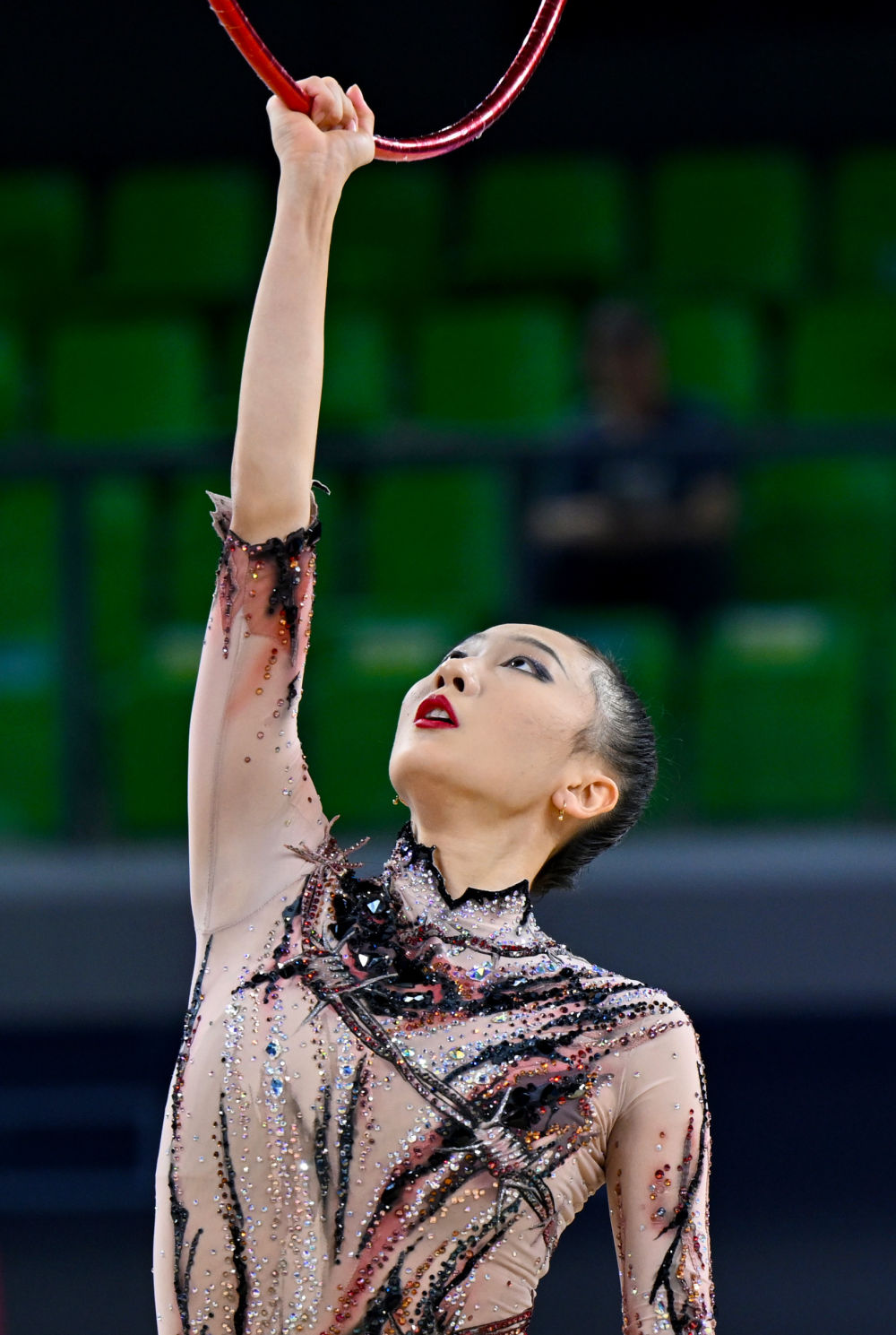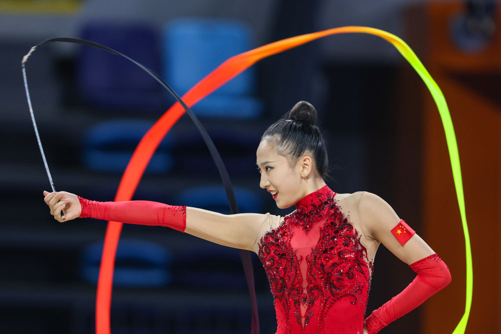 6月5日,王子露在带操比赛中。当日,在重庆市沙坪坝区举行的2025年全国艺术体操锦标赛暨第十五届全国运动会艺术体操资格赛成年个人全能决赛中,陕西电子队选手王子露获得冠军。新华社记者 黄伟 摄