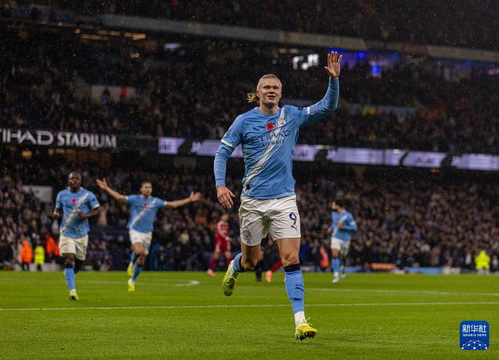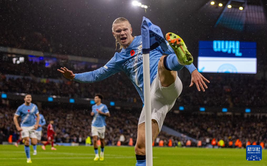 11月9日,曼彻斯特城队球员哈兰德庆祝进球。