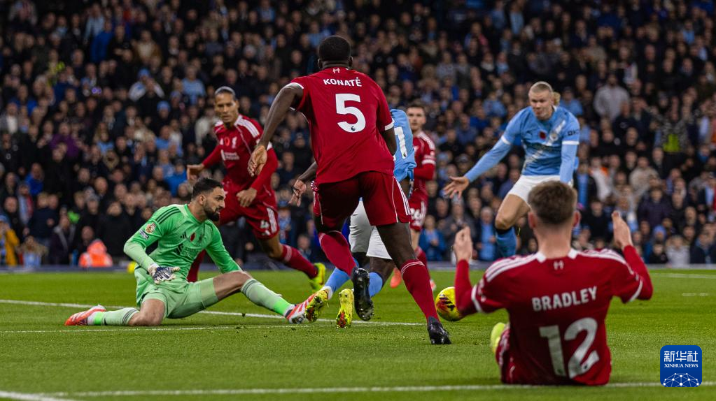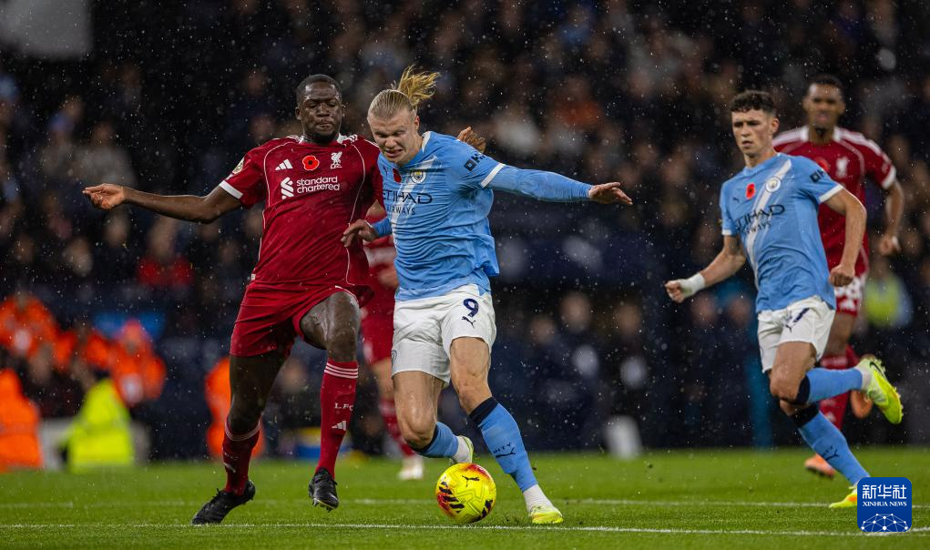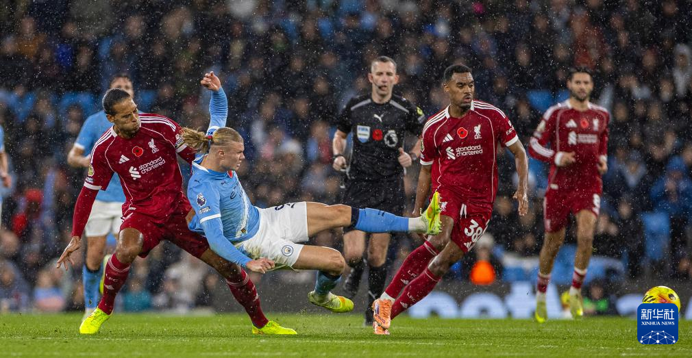 11月9日,曼彻斯特城队球员哈兰德(前中)与利物浦队球员范戴克(前左)拼抢。
