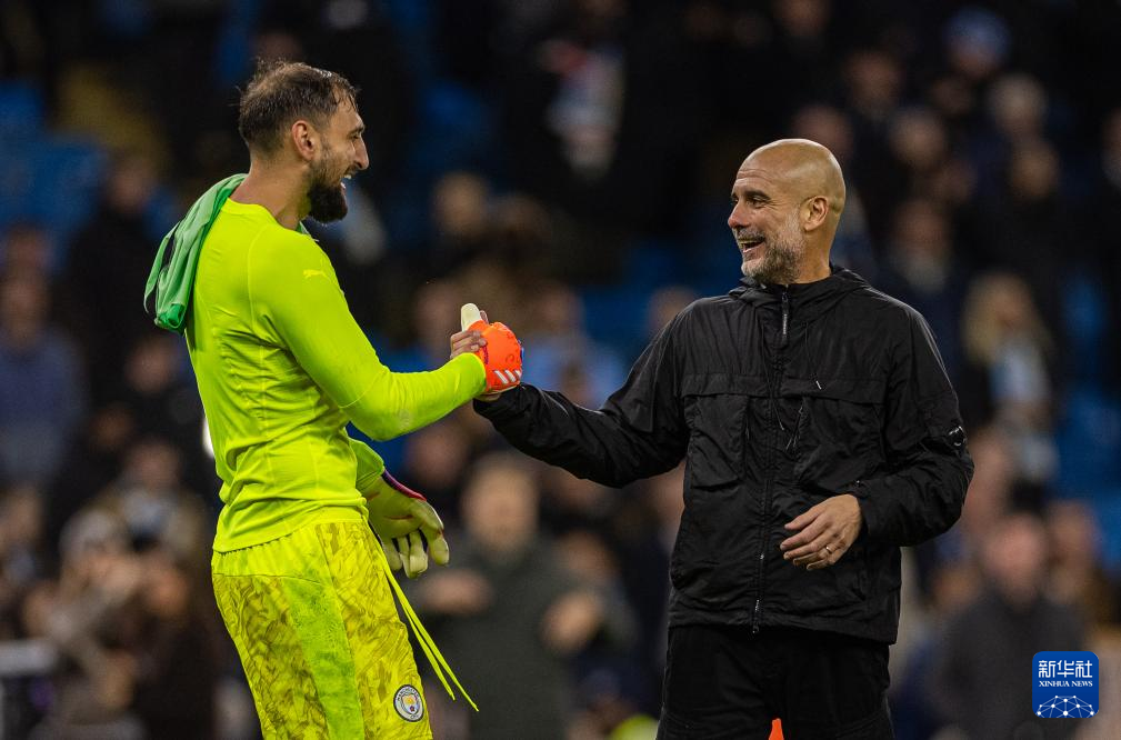 11月9日,曼彻斯特城队主教练瓜迪奥拉(右)赛后与门将多纳鲁马庆祝胜利。