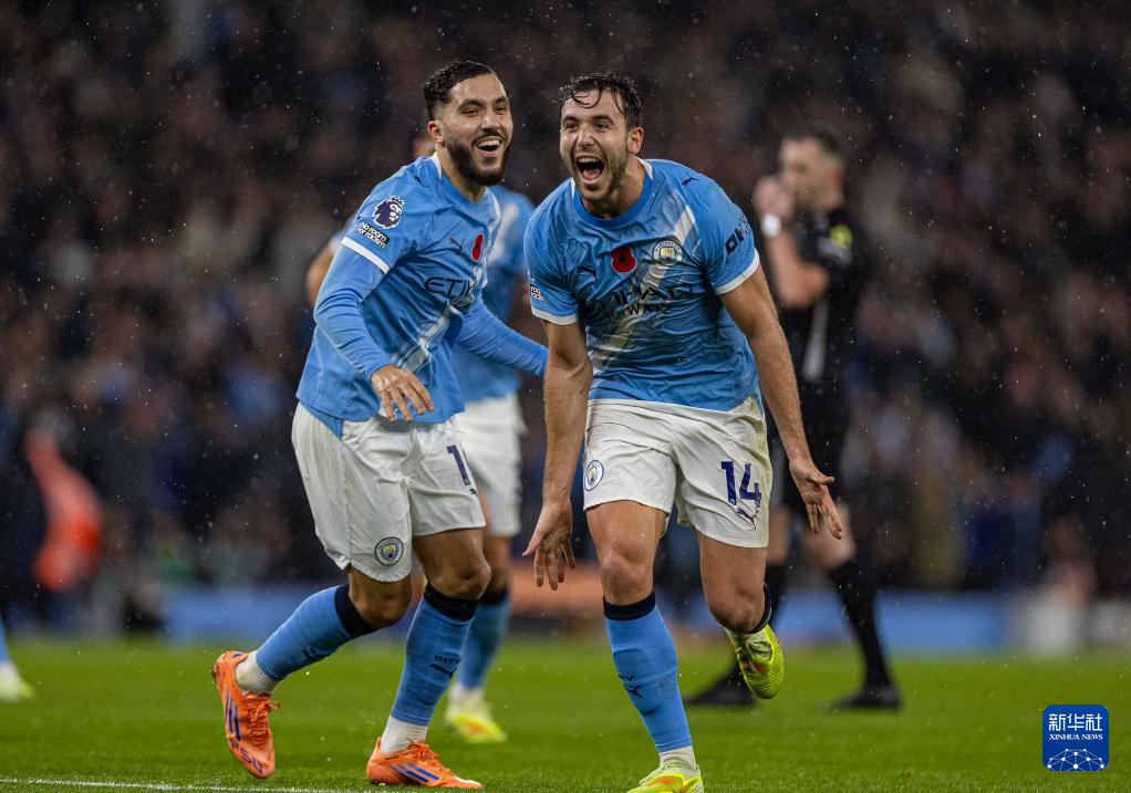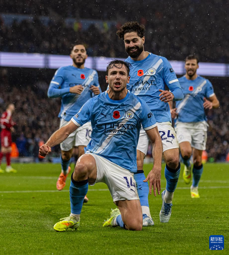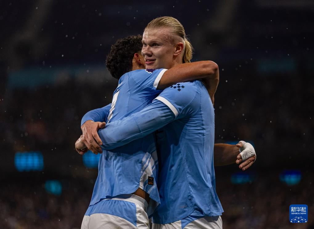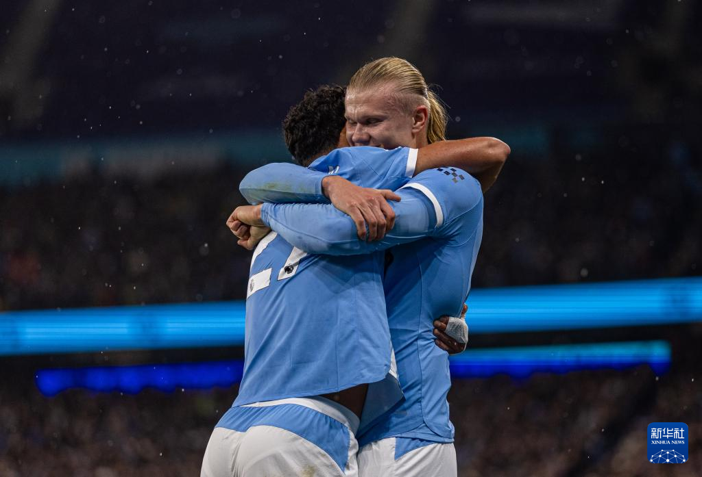 11月9日,曼彻斯特城队球员哈兰德(右)进球后与队友庆祝。