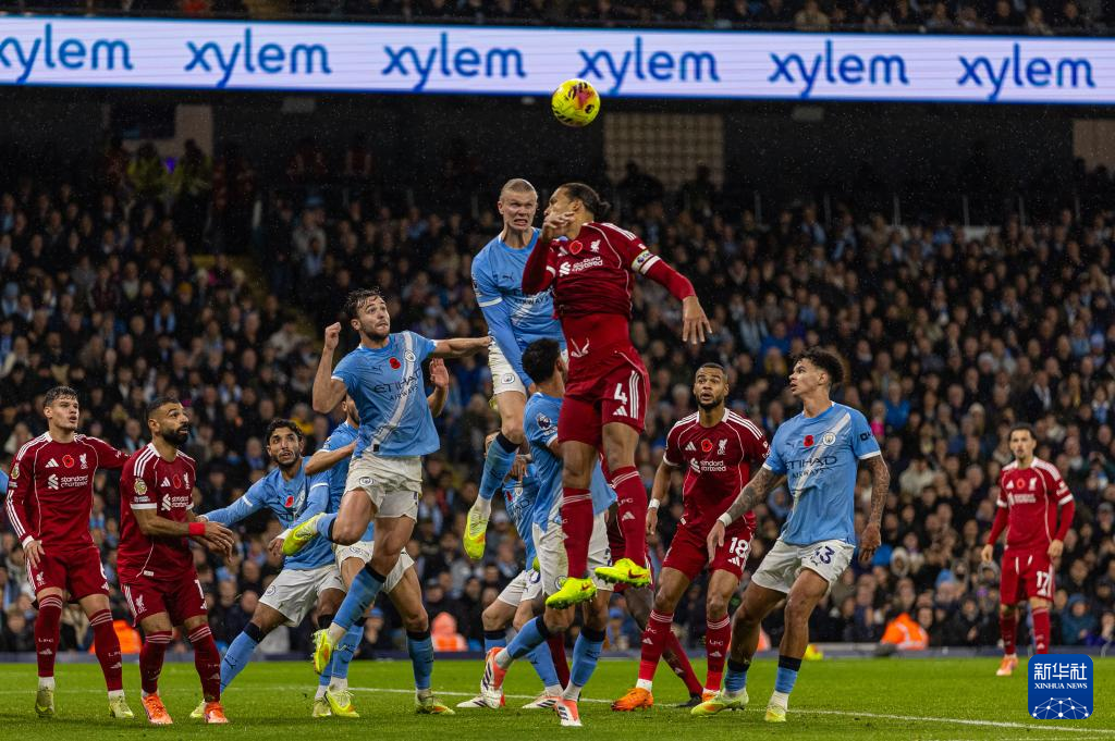 11月9日,曼彻斯特城队球员哈兰德(上左)与利物浦队球员范戴克(上右)争顶。