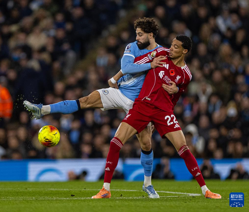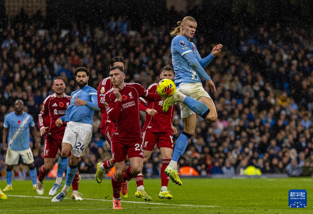 11月9日,曼彻斯特城队球员哈兰德(上)与利物浦队球员罗伯逊(前左)拼抢。