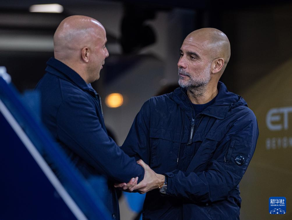 11月9日,曼彻斯特城队主教练瓜迪奥拉(右)与利物浦队主教练斯洛特在比赛前相互致意。