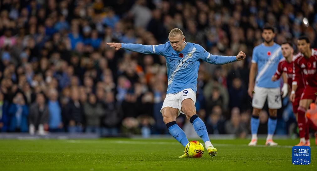 11月9日,曼彻斯特城队球员哈兰德(前)主罚点球。
