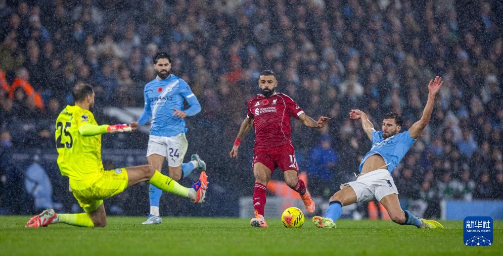 11月9日,利物浦队球员萨拉赫(右二)在比赛中射门。