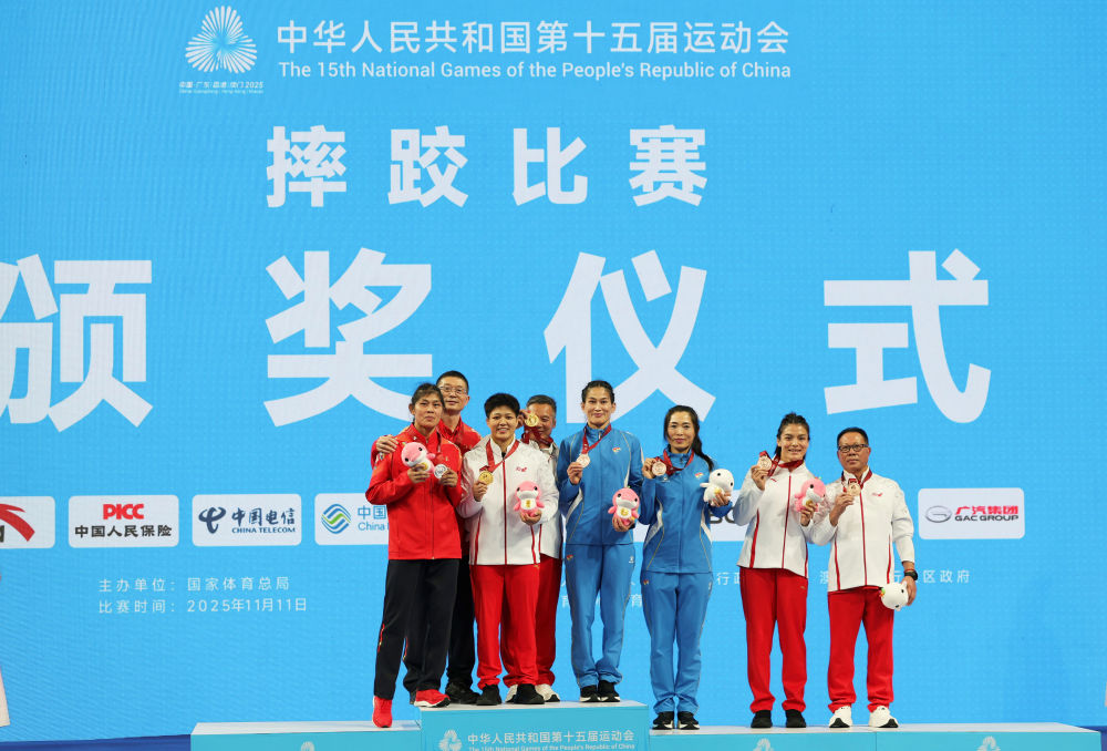 11月11日,冠军云南队选手龙佳(左三)、亚军江苏队选手韩悦(左一)、季军辽宁队选手周凤(右四)、季军云南队选手李泽露(右二)和教练员在颁奖仪式上合影。新华社记者 李然 摄