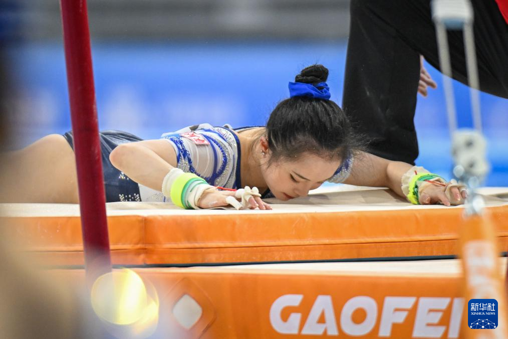 11月11日,河南队选手张怡涵在高低杠比赛中掉杠摔倒后。