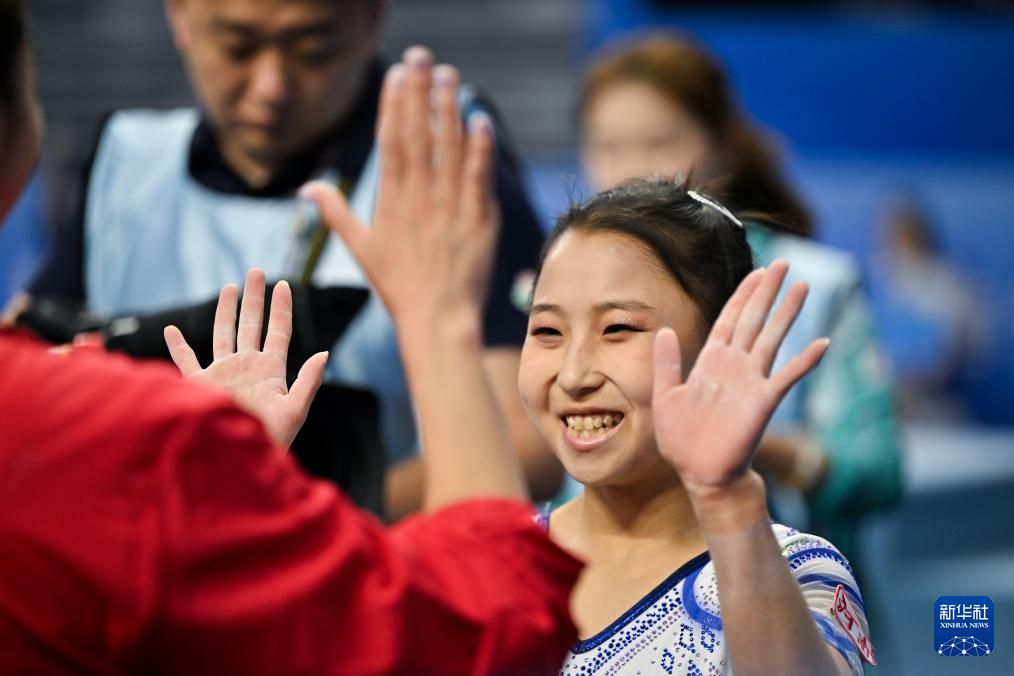 11月11日,河南队选手张婉宁在平衡木比赛后与队友击掌庆祝。