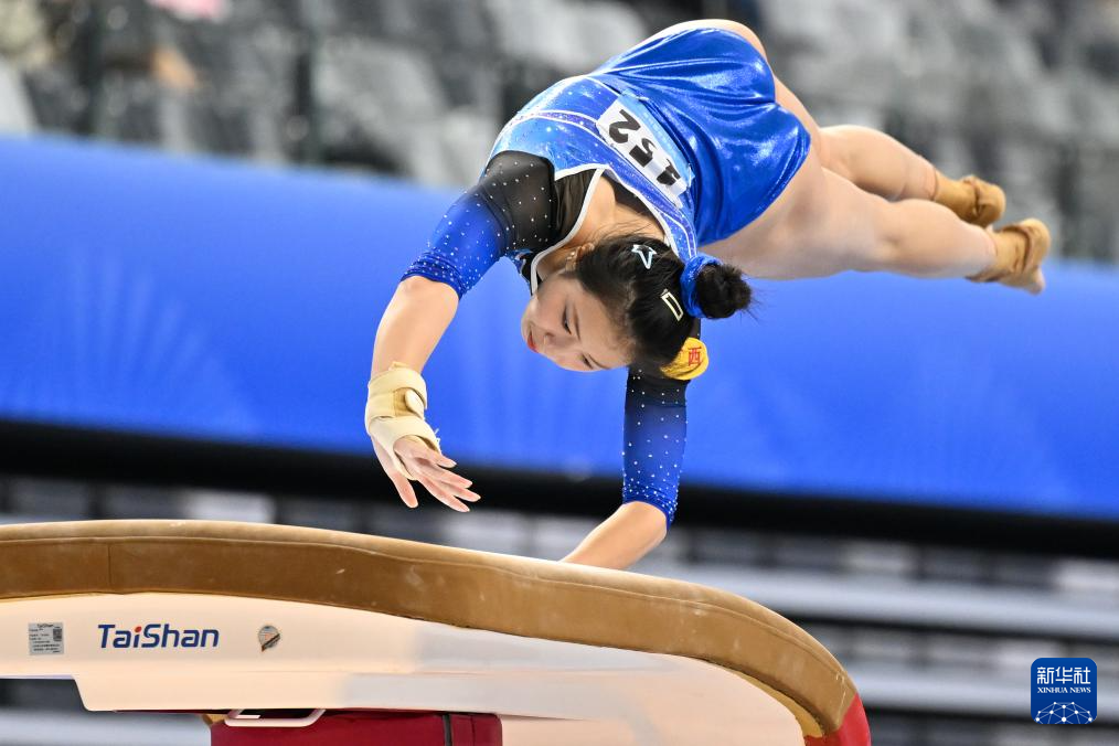 11月11日,广西队选手宾胜男在跳马比赛中。