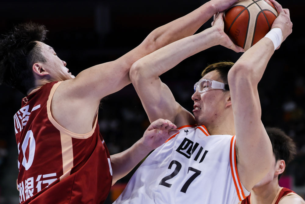11月11日,四川队球员周琦(右)在比赛中拼抢。新华社记者 李博 摄