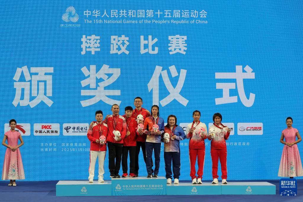 11月10日,冠军江苏队选手张金(左四)、亚军湖南队选手庞倩玉(左二)、季军广东队选手罗兰暖(右三)、季军广西队选手李雨萱(右五)和教练在颁奖仪式上合影。