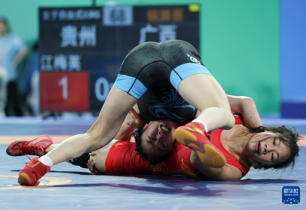 11月10日,广西队选手李雨萱(上)和贵州队选手江梅英在女子自由式53公斤级铜牌赛中。最终,李雨萱战胜江梅英获得铜牌。
