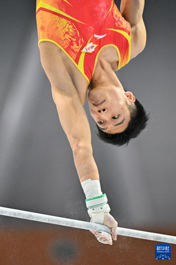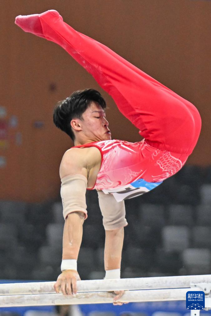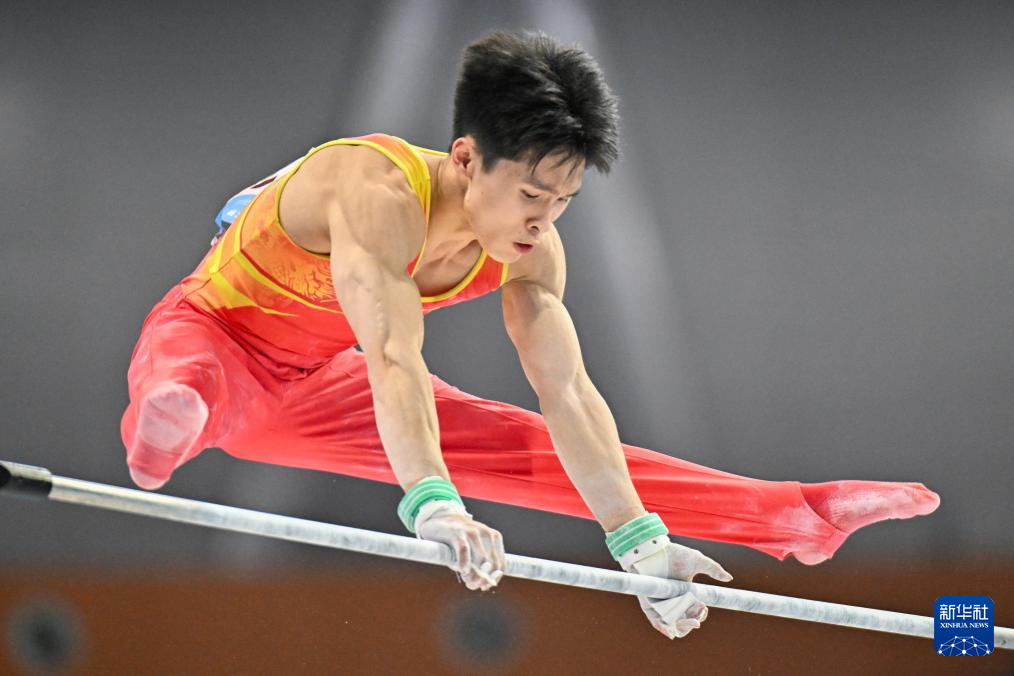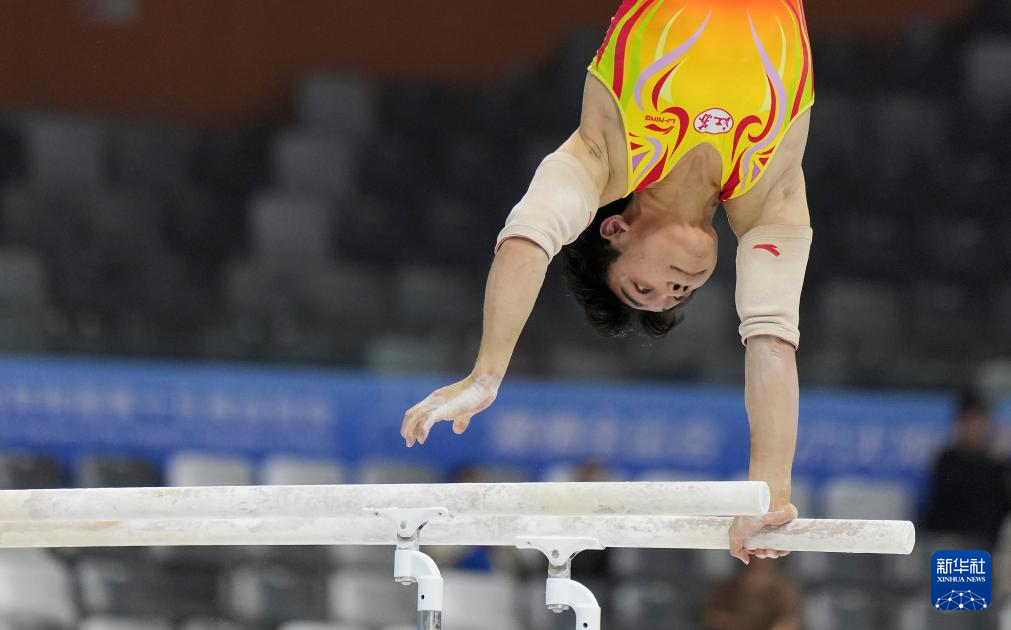 11月10日,江苏队选手何翔在双杠比赛中。